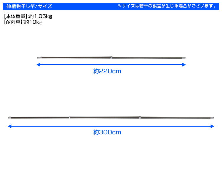 商 品 詳 細 内容 本体 ×2 サイズ (約)長さ220〜300cm×直径3cm 耐荷重 (約)10kg ハンガー数 21カ所(ハンガー掛け付きのみ) 材質 ステンレス、ABS樹脂 他 保証期間 7日間 ※商品到着後7日以内の初期不良・破損のみご対応させていただきます。